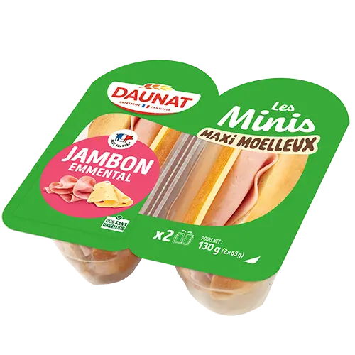 Le Mini jambon emmental est un petit pain maxi moelleux au goût légèrement sucré garni de jambon origine France, d'emmental et d'une mayonnaise allégée sans conservateur.